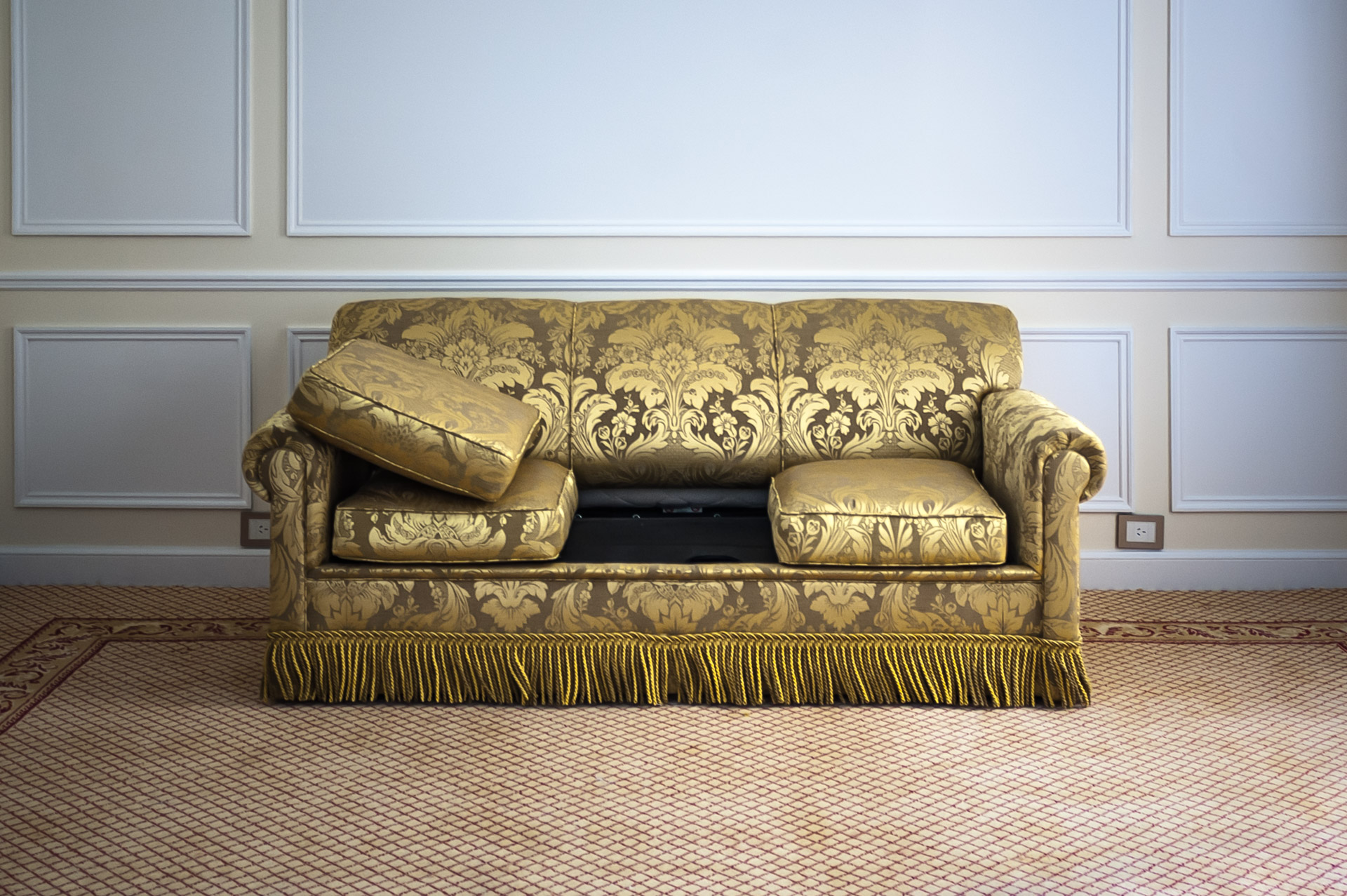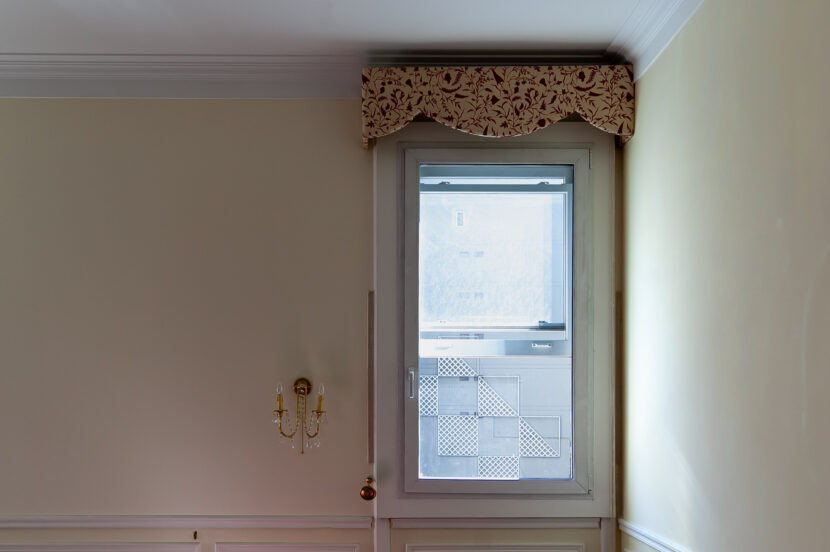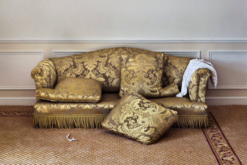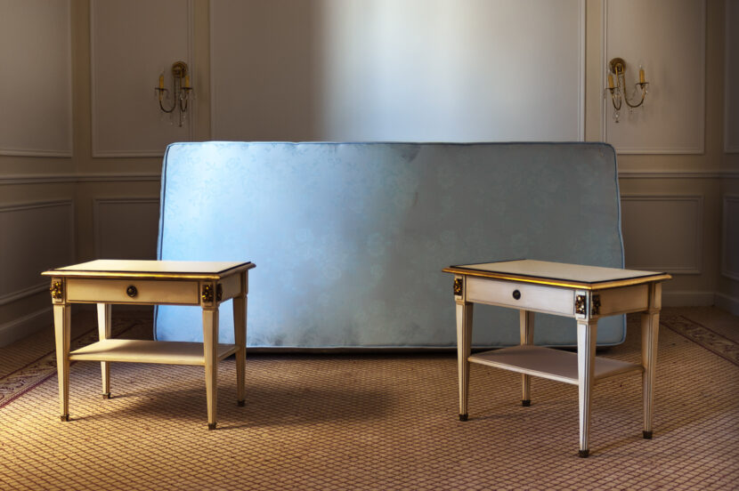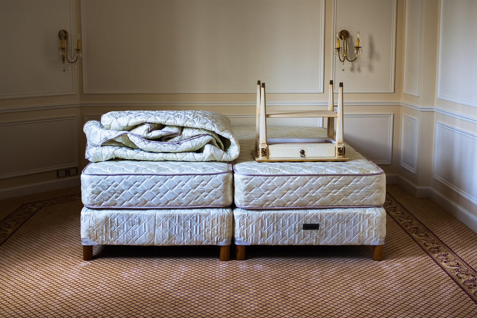 Hotel Palacio es un trabajo realizado en uno de los hoteles de lujo de Buenos Aires. Las imágenes fueron tomadas en habitaciones en proceso de remodelación, en el período que transcurre entre el final de obra y la decoración definitiva. Hotel Palacio es el registro de una indefinición. Es la representación de un orden en un tiempo que pareciera desprendido. Estalla ante la ausencia de lo viejo y un futuro marcado pero todavía ajeno.